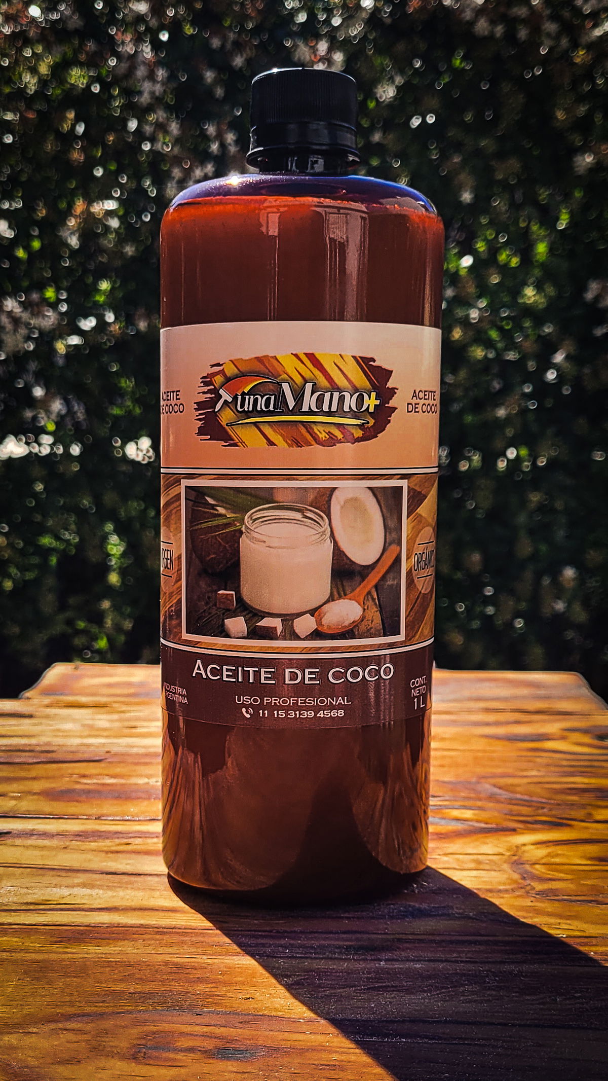 La publicación corresponde a una botella de 1 litro de Aceite de Coco Virgen y Orgánico, con aroma y sabor natural a coco